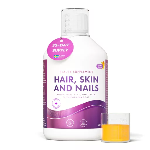 A különféle vitaminok és ásványi anyagok hiánya egy sor egészségügyi problémához vezethet. Ezek közé tartozik a rossz minőségű bőr, a fénytelen, töredezett és hulló haj, illetve a különféle körömelváltozások. A Swedish Nutra Hair, Skin & Nails folyékony vitamin a kollagén, hialuronsav, ásványi anyagok és a gyógynövények erejével veszi fel a harcot az imént felsorolt problémák ellen. 27 aktív hatóanyagának köszönhetően belülről javítja a bőr textúráját, továbbá a haj, a körmök, a fogakat és az ínyeket egészségét. Antioxidáns tulajdonsága révén megakadályozza a szabad gyökök káros hatásait és hozzájárul a kötőszövetek egészségéhez.