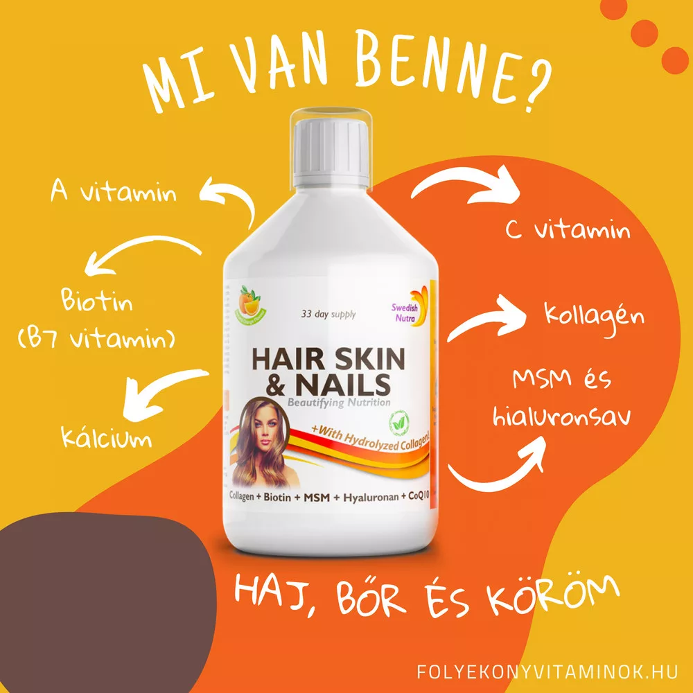 A Swedish Nutra Hair, Skin & Nails folyékony vitamin megszünteti a bőr-, haj- és körömproblémákat. Kiemelkedően hatékony, mivel a kollagén mellett hialuronsavat is tartalmaz. Bőröregedés-gátló, ránctalanító és bőrfeszesítő tulajdonságú, továbbá energizál és hozzájárul a gyors sebgyógyuláshoz.